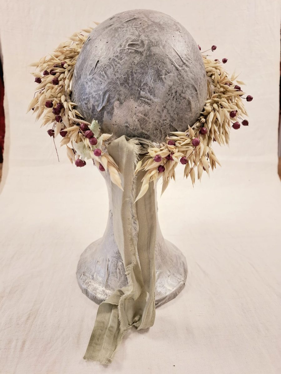 Compuesta de avena con ligero tono verdoso y semillas de lino tono borgoña. Lazo verde desilachado para ajustar.