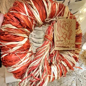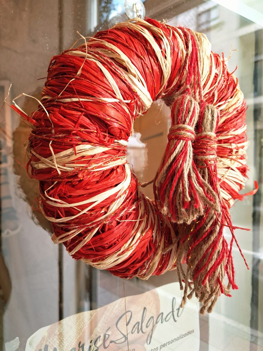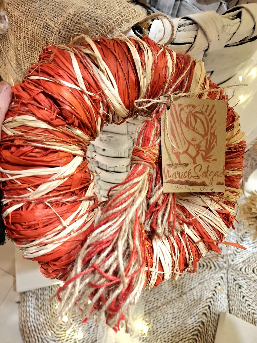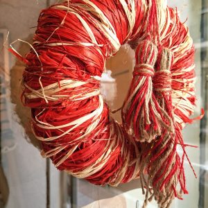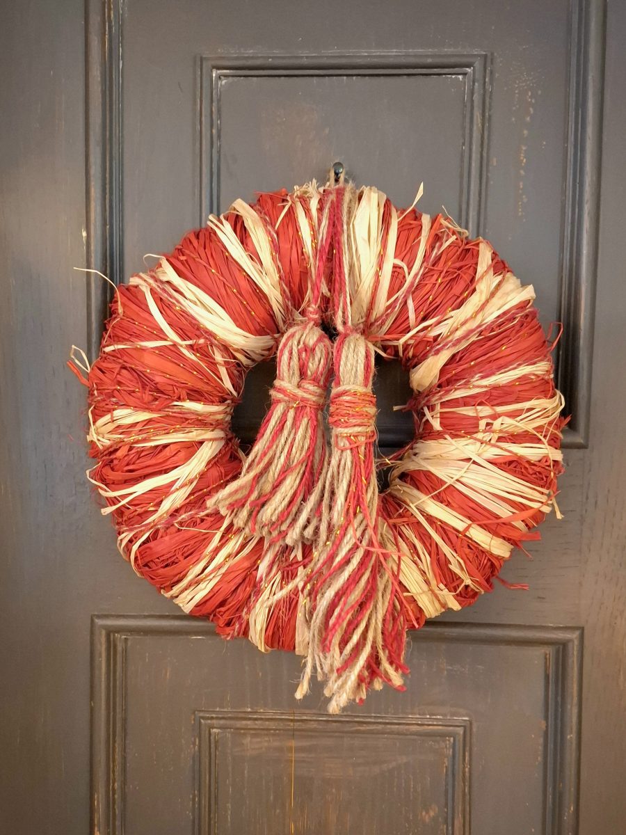 Corona hecha con papel reciclado duro recubierta de rafia color rojo y natural, dorada , lino e hilo dorado .