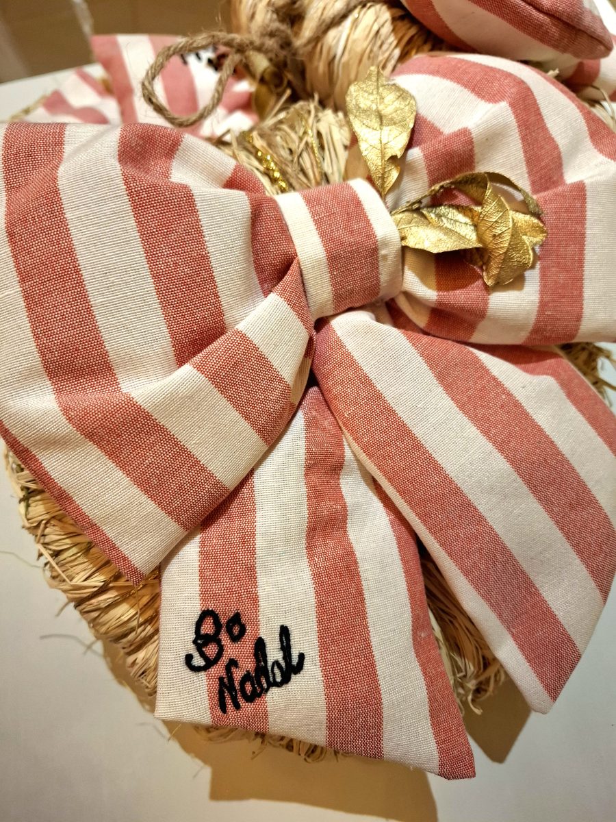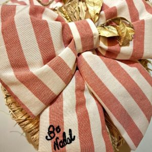 Con lazo acolchado de loneta suave de rayas deseando un BO NADAl bordado a mano en hilo negro.