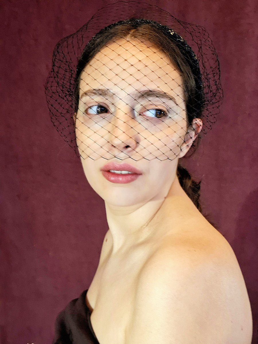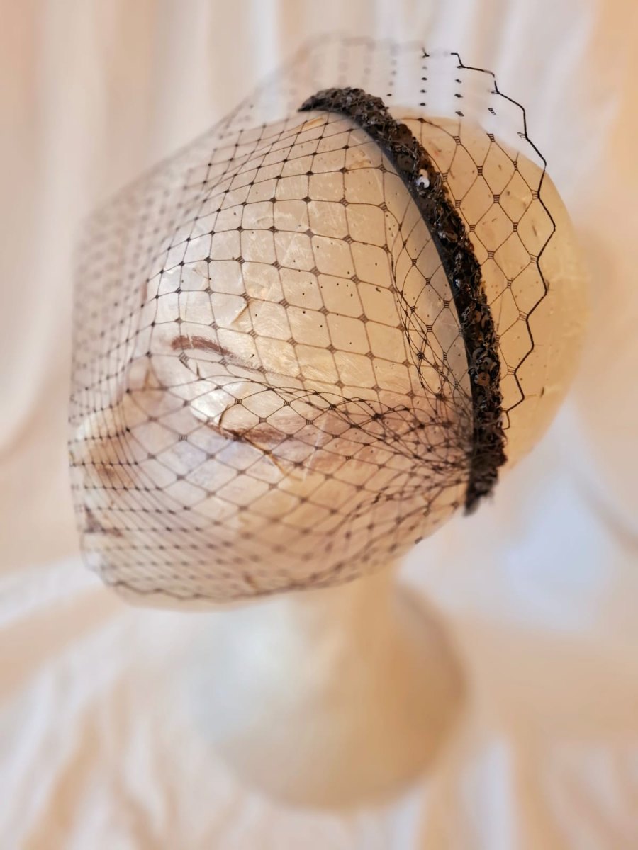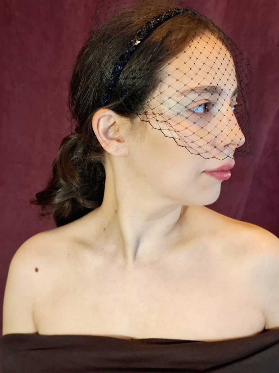 Diadema con velo en color negro, con pasamanería cosida detrás de lentejuela diminuta