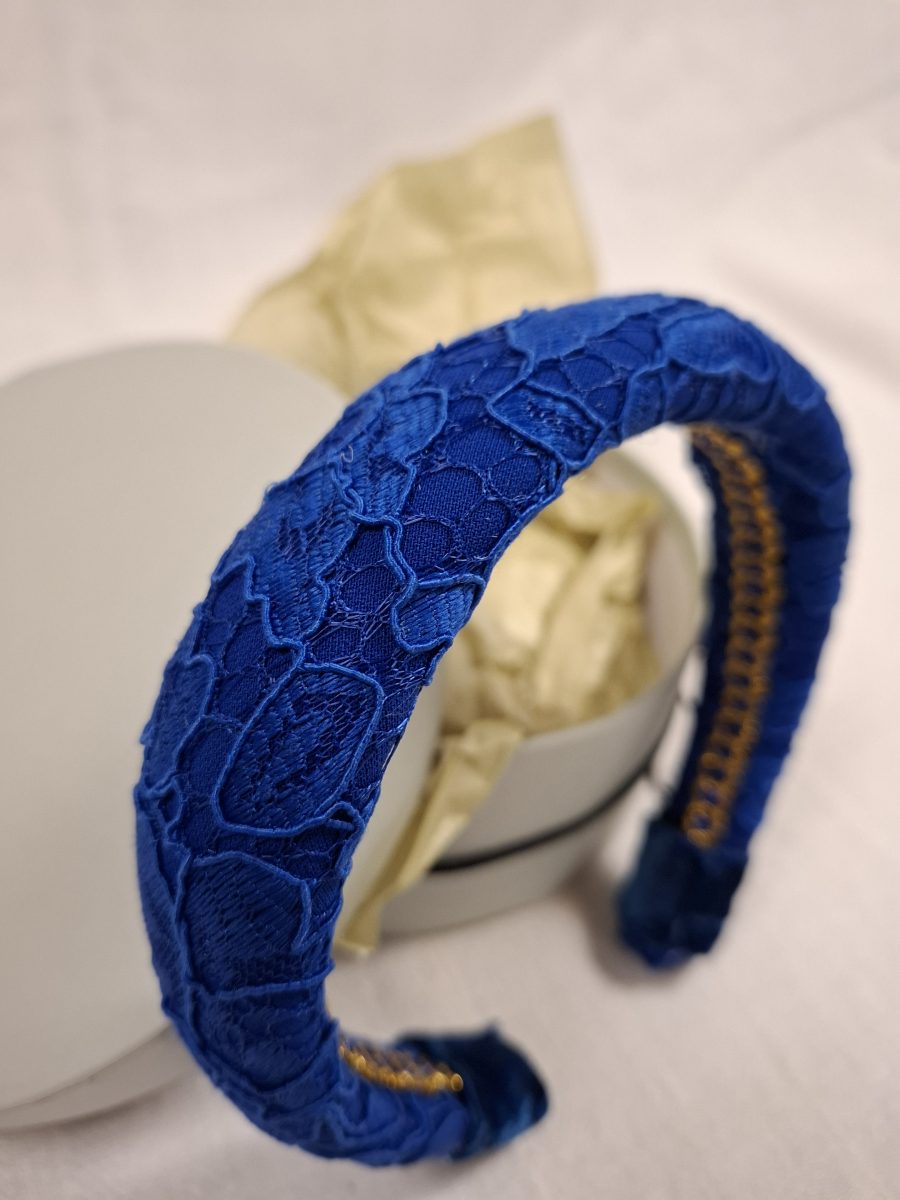 Diadema confeccionada a mano con guipur sobre crepé elástico de 4cm de grosor.