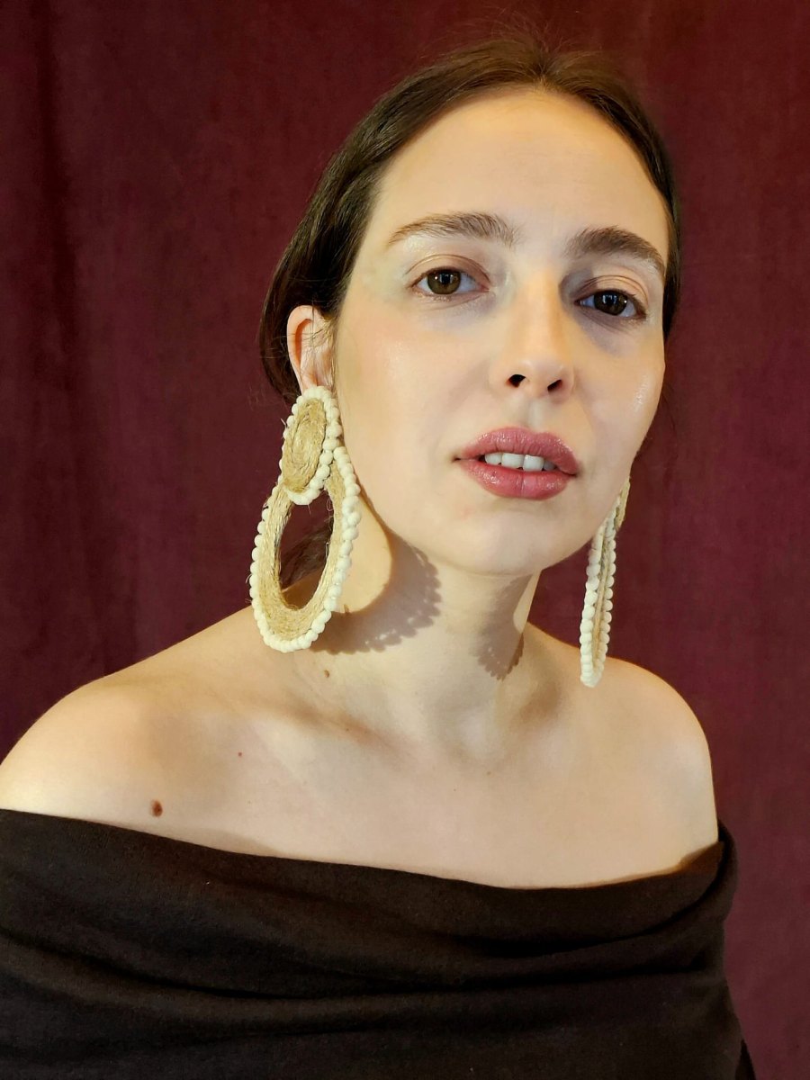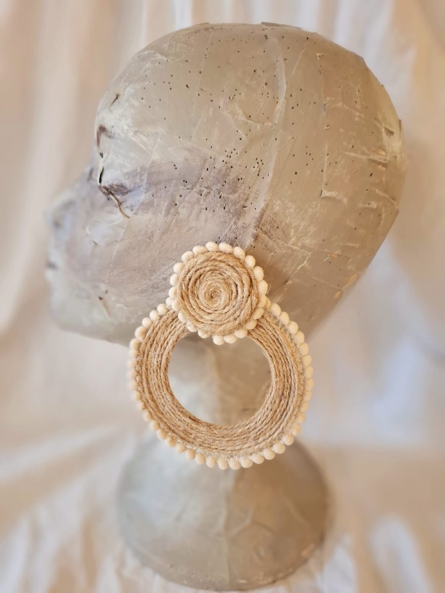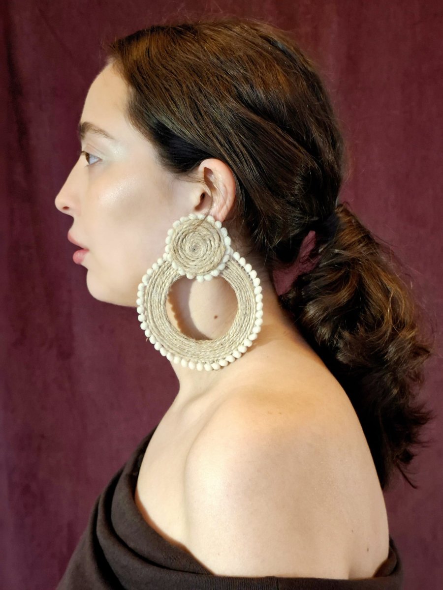 Pendientes de hilo de lino. Muy ligeros. Hechos sobre tela de color natural, de ribete marfil bordeándolo.