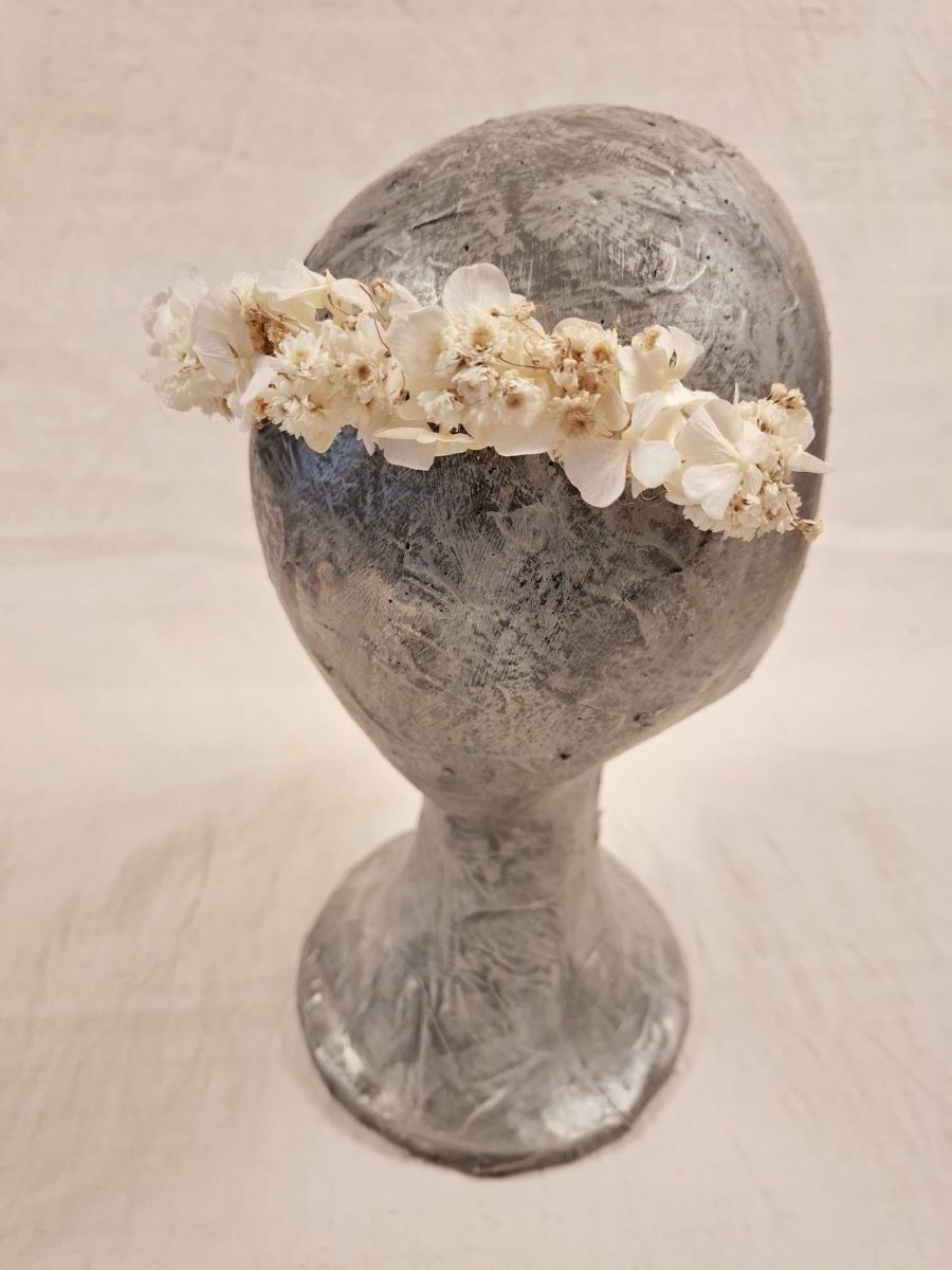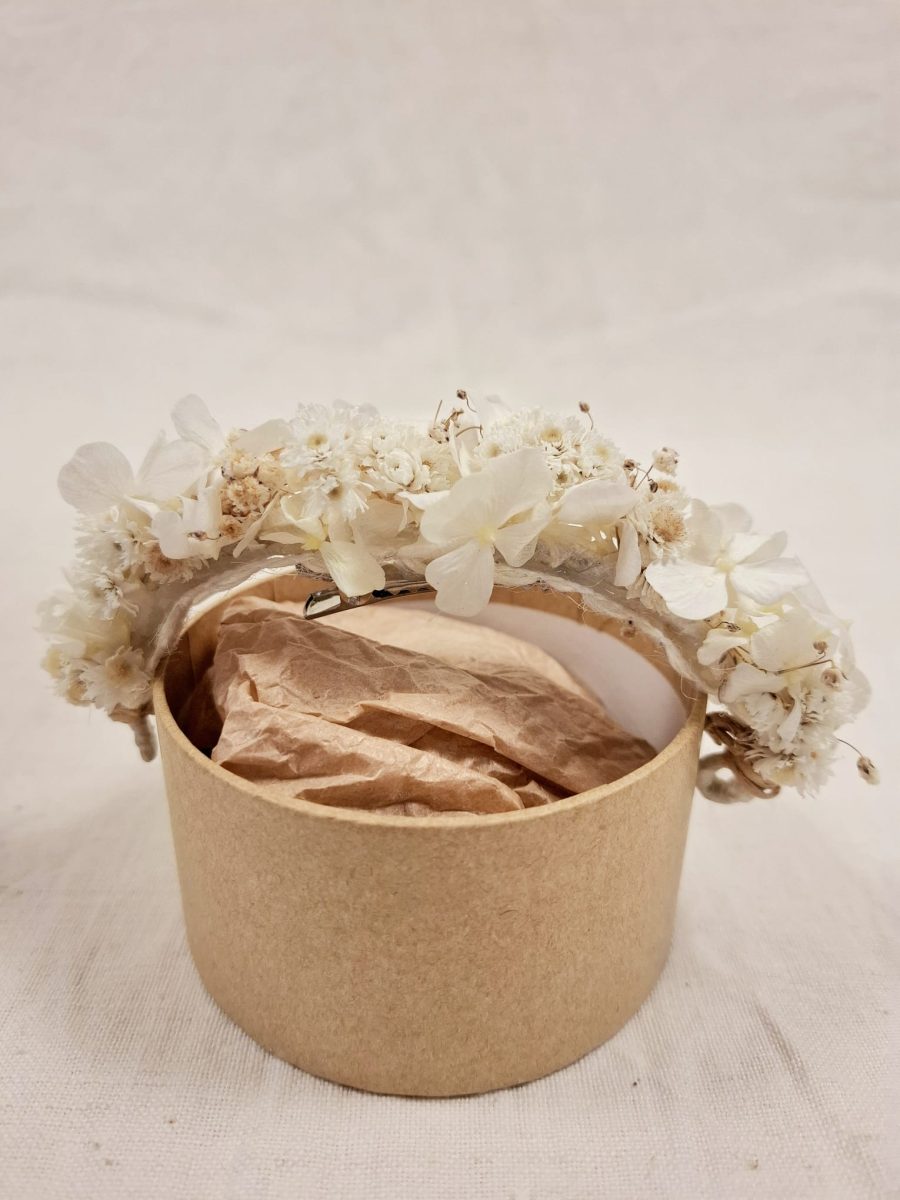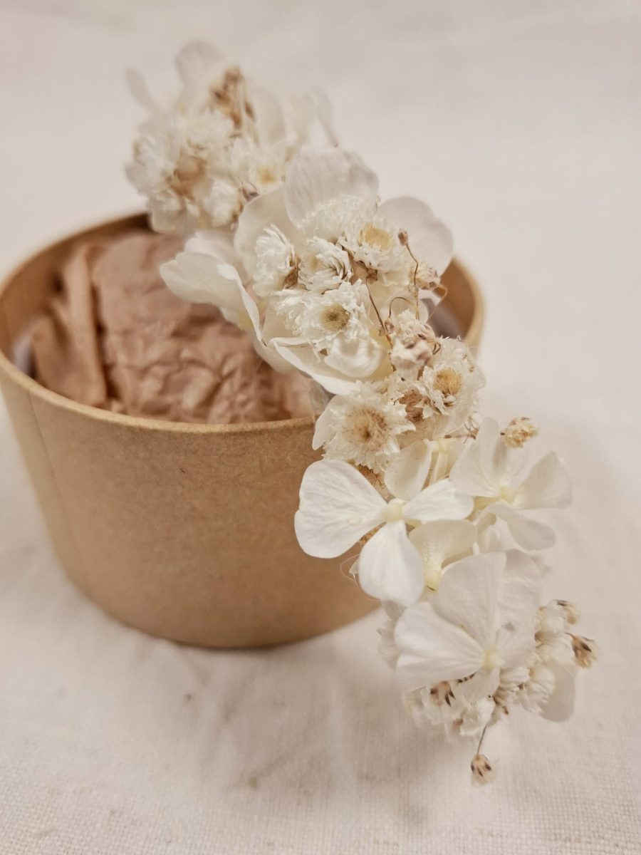 Tocado floral de 12cm en anafhalis triplinervis y paniculata color natural para semirrecogidos, moños o laterales. Agarre con pinza en el medio y laterales para enganche.