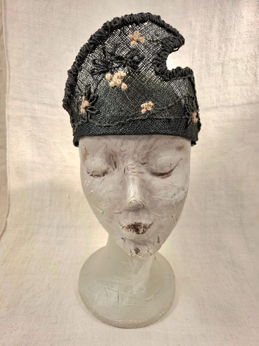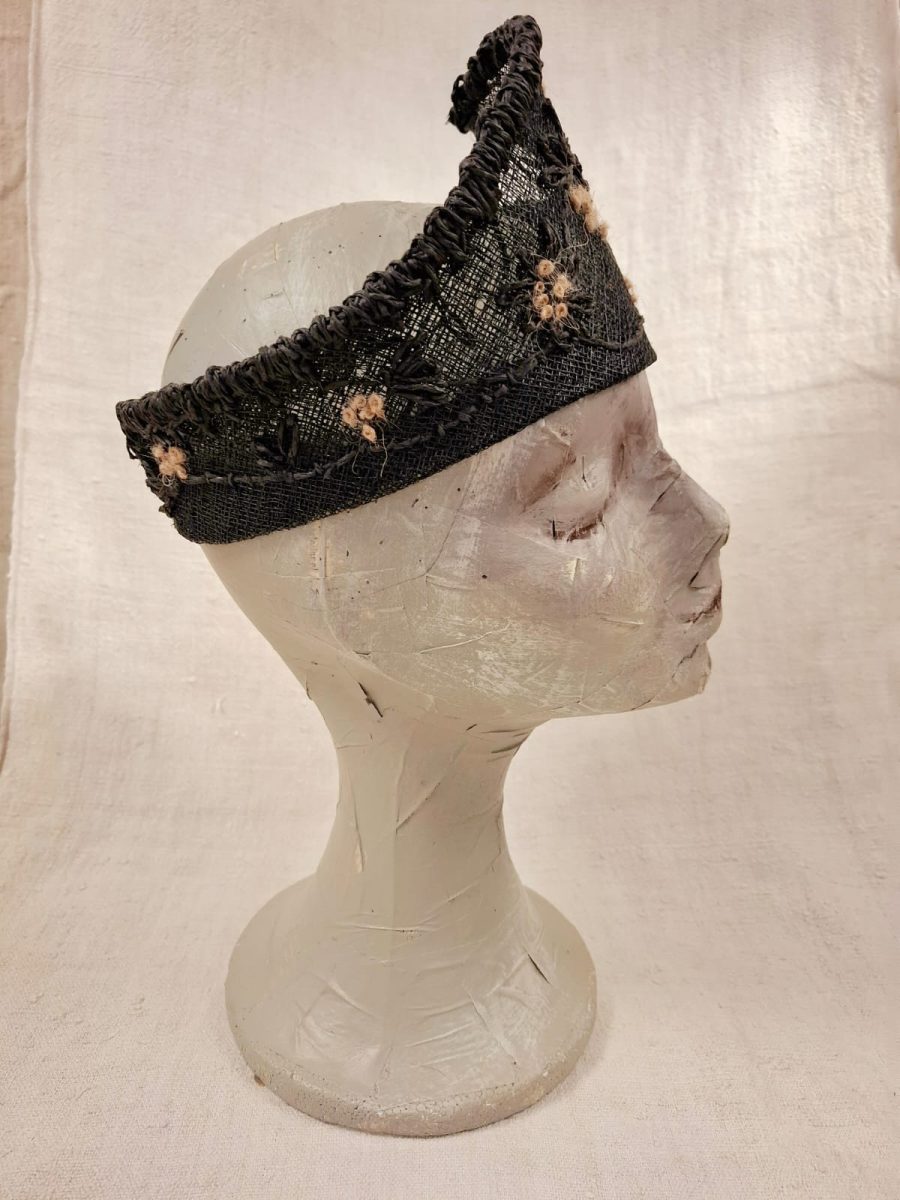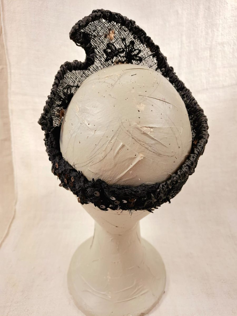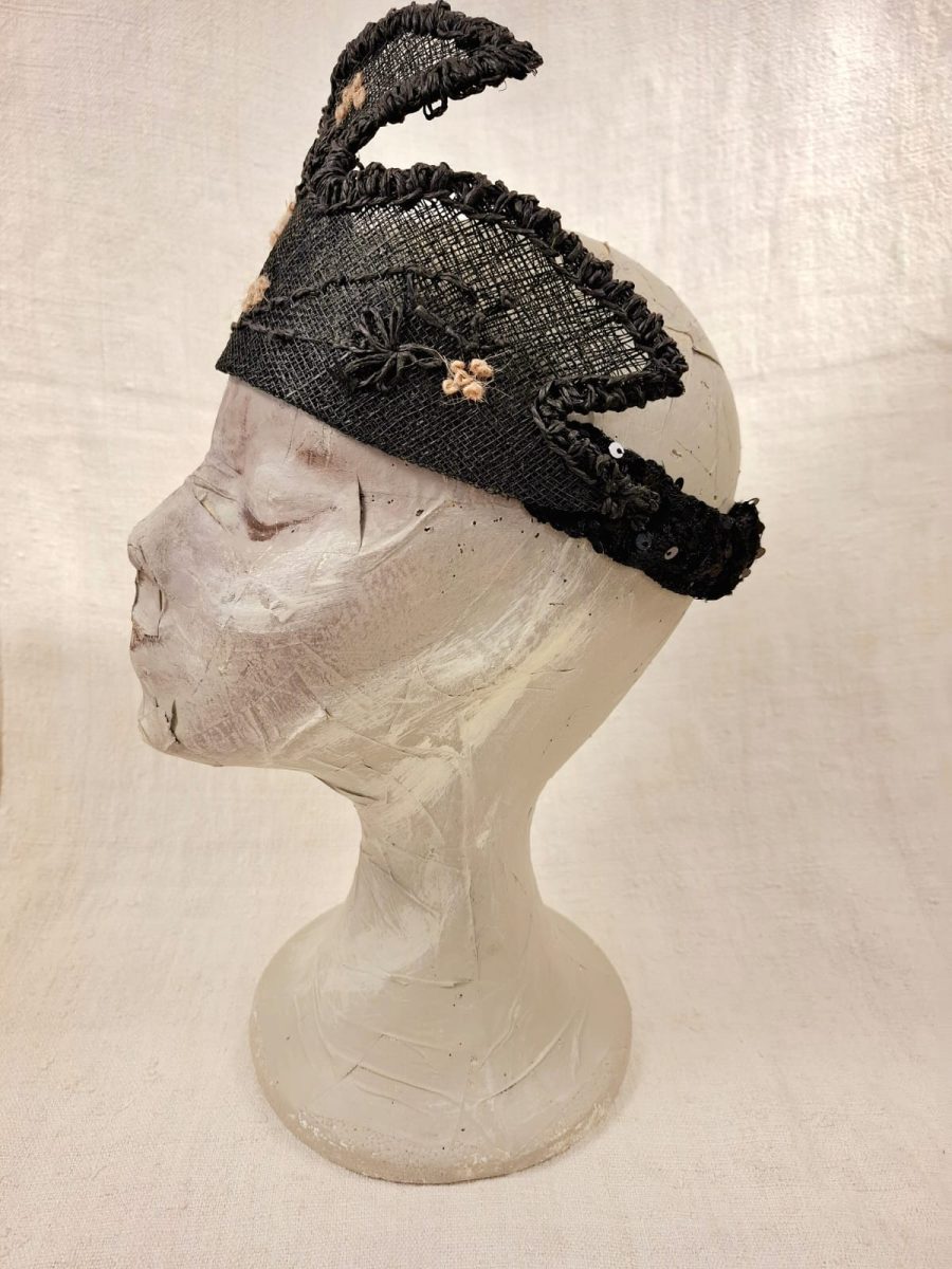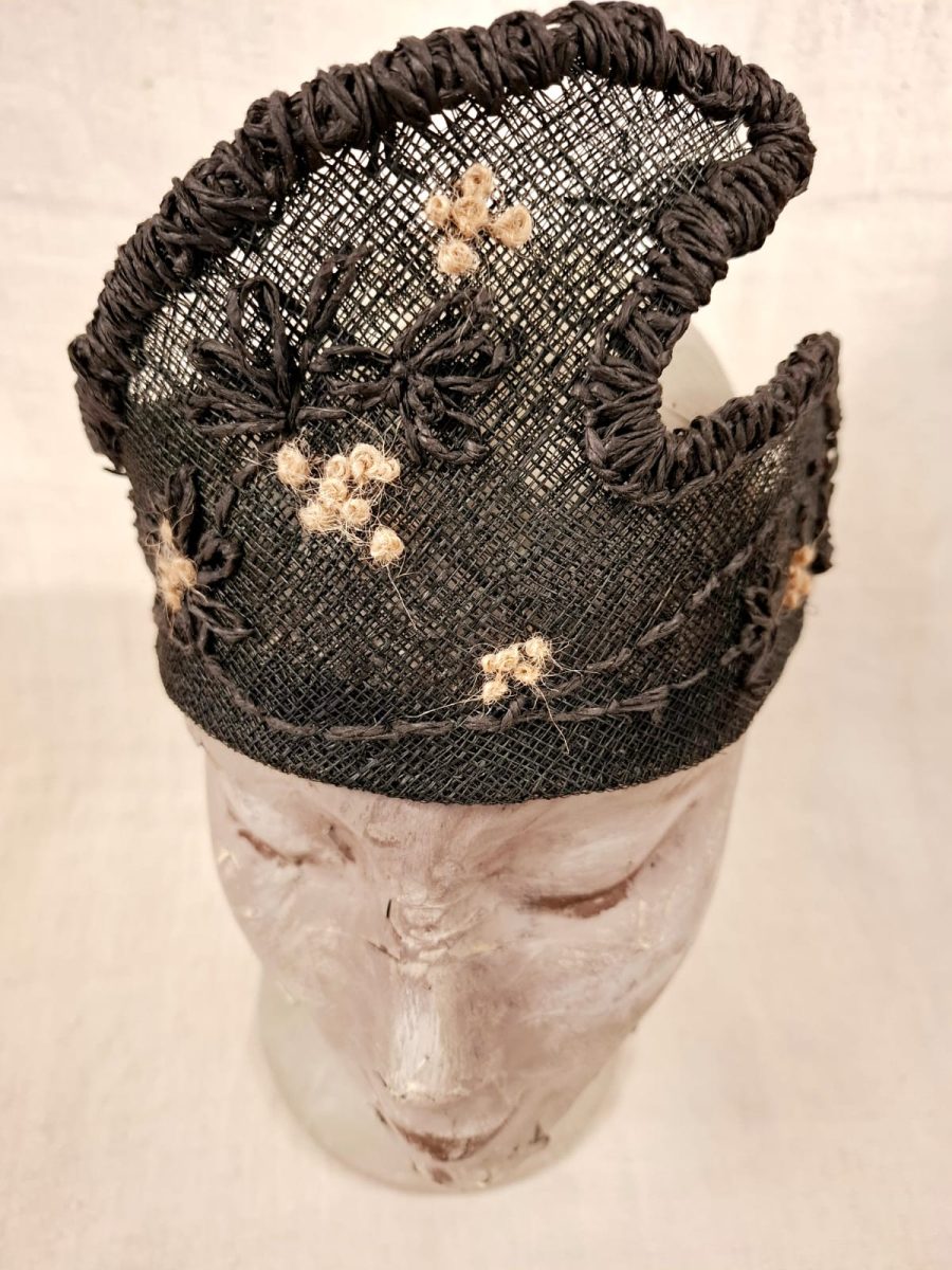 Turbante de sinamay moldeado en busto. Ribeteado y bordado con tira de papel y lino color natural. 42cm de diseño con sujeción de goma cubierta de tela con lentejuelas.